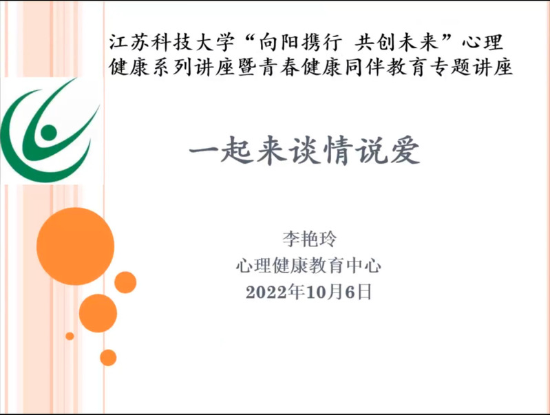 10月6日下午15:30,由江苏科技大学心理健康教育中心、广发体育官方网站,广发体育(中国)有限公司主办的“向阳携行,共创未来”心理健康教育系列讲座在笃学楼108教室顺利开展。本次讲座通过线上线下相结合的形式,邀请校心理健康教育中心专职教师李艳玲老师进行《略谈大学生情感》主题宣讲,旨在帮助学生明确恋爱观,普及性爱安全知识。会议由计算机学院心理辅导员刘宝达老师主持,各班级同学近200人参加。