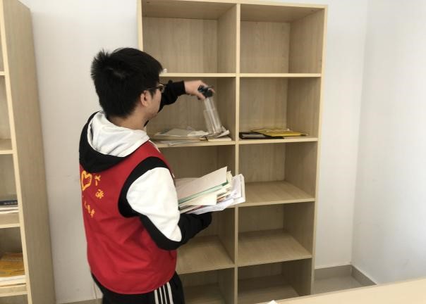 在自习室等公共区域,志愿者们进行了卫生清扫,将杂物规范摆放至置物柜,并对插排断电处理,对杂物进行了整理,为同学们创建安全、卫生的公共空间。