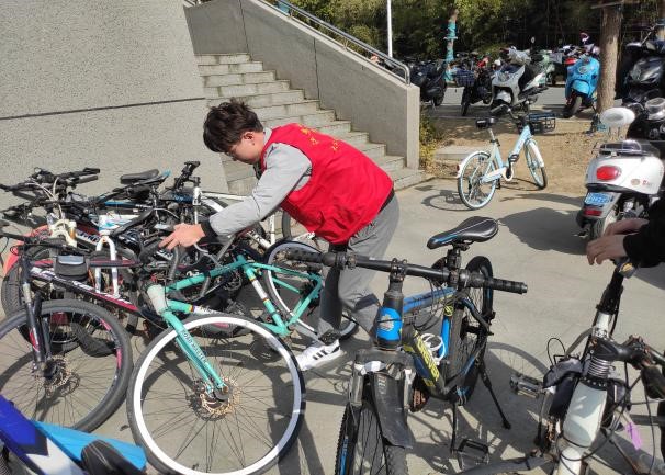 在校园中规范停放老旧自行车,对宿舍外部周围环境进行了整理与清洁,确保公共区域无垃圾、无杂物,自行车摆放规范。