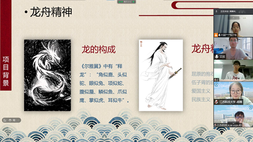 8月17日至19日,线上宣讲活动正式开始。本次宣讲对象为计算机学院部分留校同学,小队成员黄鹤年担任宣讲人,为同学们介绍项目传统文化“龙腾四海”。关于龙的形象,黄鹤年讲到:“龙是由鹿 、牛、鱼、兔等9种动物的特征融合而成,蕴含着中华文化兼容并蓄的特点。”