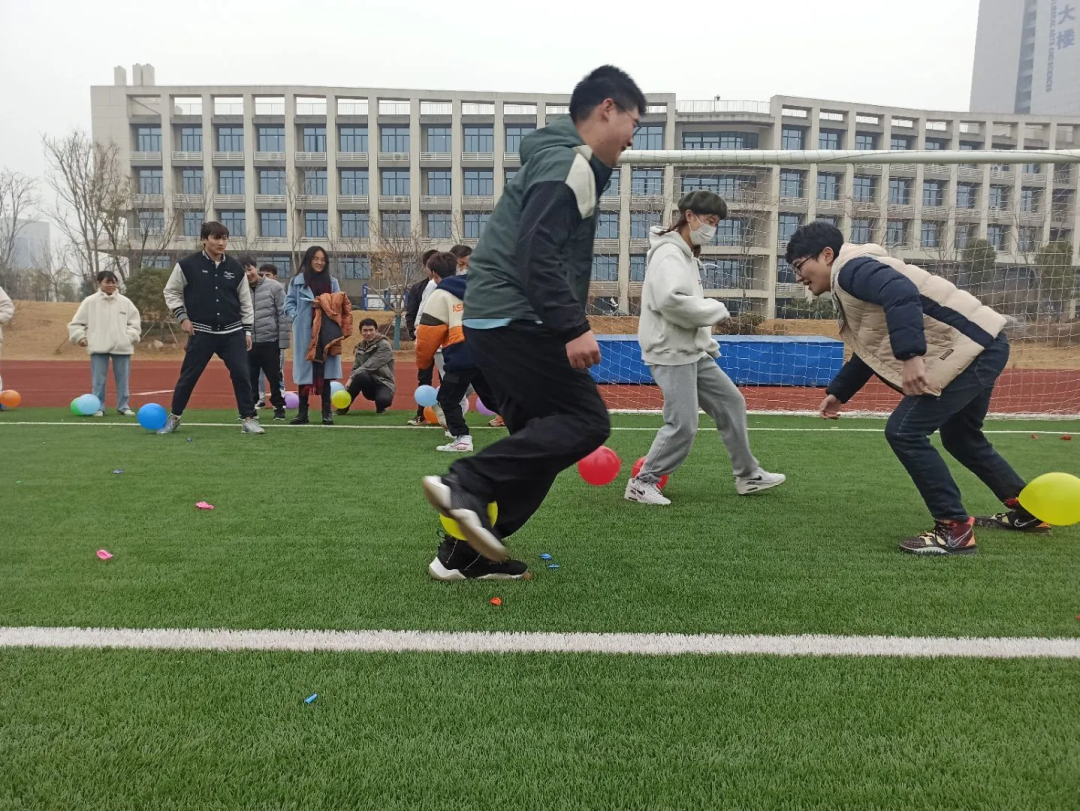 上午10:00,参赛人员集结完毕。脚下气球谁来踩?随机分配,两支队伍强强对战。一场热身运动随即拉开。这不仅考验同学们的反应能力,更考验团队的合作能力,同时对参赛队员的体力也有着极大的要求。在激烈的角逐中,脚上的气球被逐一击破,三支队伍打败对手,冲出突围,取得首战胜利。