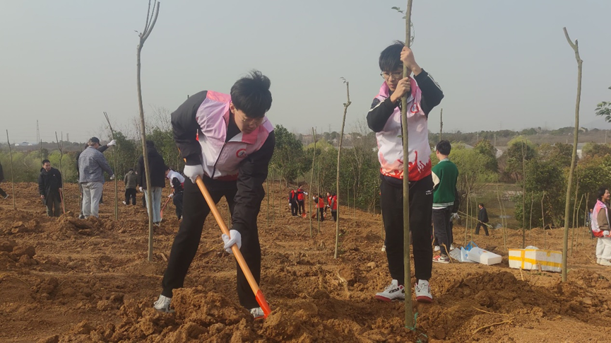 期间同学们有说有笑,也不在乎铲泥土过后酸痛的胳膊,也不在乎尘土飞扬弄脏的衣裤。植树造林,绿化家园,是造福当代,惠及子孙的伟大事业,是改善生态,优化环境的一项重大举措,也是我们每一位青年学子应尽的责任。