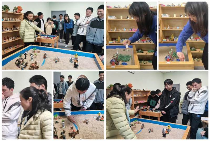 团辅开始前,王老师为同学们解说了沙盘活动的基本的注意事项,让同学们以放松的心态进行活动,同学们分为两组,每一组的成员依次的取物件摆放在沙盘上,现场的气氛非常的活跃。在沙盘上摆放物件后,王老师通过沙盘中摆放的物件的类型和位置,渐渐地描述同学们的心理状态,同时与同学们进行深入沟通,帮助同学们了解自己,释放内心压力。