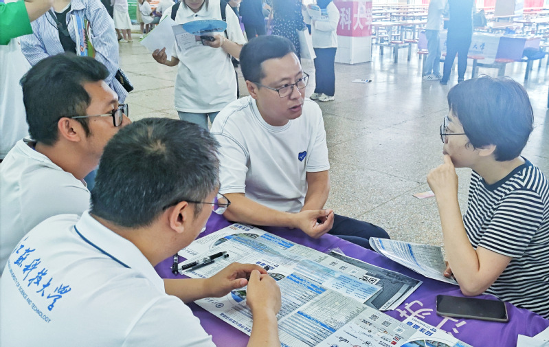 计算机学院镇江本地招生宣传队伍包括学院领导5人、专任教师8人、学生处特请老师1人、全体辅导员6人、招生助理等40余人组成。学院领导师生深入镇江地区各个中学的招生宣传咨询会现场,对前来咨询的家长现场答疑解惑,介绍学校办学特色、招生政策,为现场的家长考生带来专业权威讲解,同时,本次招生宣传工作采用线上线下相结合形式,线上建立了3个“江苏科技大学镇江地区报考咨询群”共计500余人,为考生家长提供一站式报考指导服务,线下咨询了解、建立联系,线上跟进一对一辅导。现场咨询气氛火热。