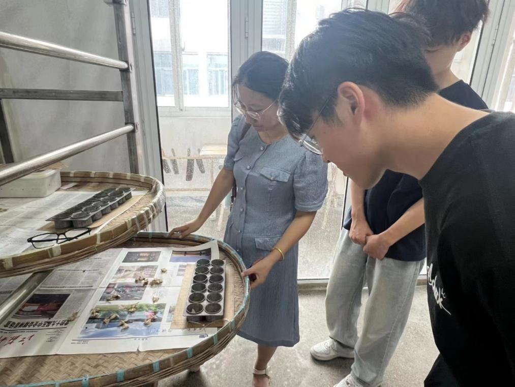 蚕,这一自古以来便与人类文明紧密相连的小生命,其生长过程如同一部生动的自然纪录片。在晨曦微露的蚕室里,计算机学院的实践队员们迎来了他们探索桑蚕文化的第一站。这一环节,老师为成员们展示了蚁蚕、幼虫、蛹以及成虫等各个阶段蚕的形态以及相应的讲解,为成员们提供的直接的视觉体验,近距离感受生命从微小到壮大的壮丽篇章。