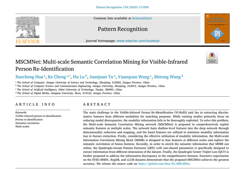 近日,计算机学院程科教授团队在行人重识别(ReID)研究方向取得新进展,团队研究成果“MSCMNet: Multi-scale Semantic Correlation Mining for Visible-Infrared Person Re-Identification”被模式识别与人工智能领域国际顶级期刊《Pattern Recognition》接受,并在线发表。论文第一作者为2022级硕士研究生华雪成同学,计算机学院程科教授为通讯作者,江苏科技大学为第一完成单位,江苏科技大学涂娟娟副教授,江苏大学陆虎副教授、河北工业大学王元全教授和江南大学王士同教授为论文共同作者。