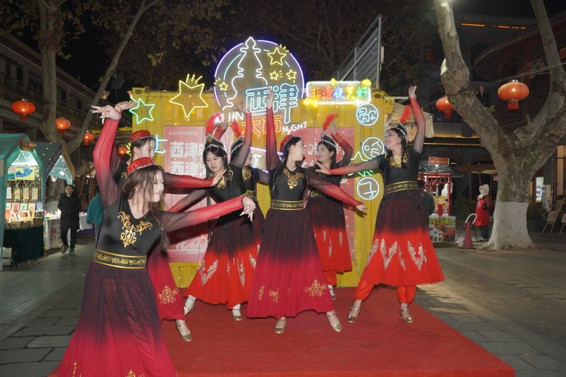 夜幕降临,来自各民族的学生兴奋地在镇江达孜民族交往交流中心点燃了篝火,伴随着粗狂的音乐载歌载舞和游客跳起了西藏锅庄舞。西津大市晚会也如约而至,新疆舞、藏族舞、相声、器乐、孙悟空扮相热辣滚烫,吸引了诸多游客和市民的驻足观看,氛围感拉满!
